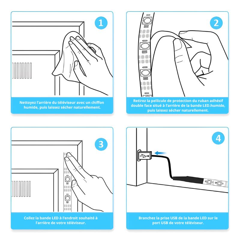 Installation facile, sans bricolage : il suffit de la brancher en USB et de choisir l’effet lumineux souhaité grâce à ses commandes simples. Une solution discrète, pratique et esthétique, pour ajouter du confort visuel à votre intérieur, à tout moment de la journée.